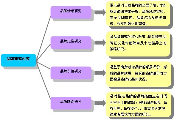 品牌是一種名稱、屬于、標(biāo)記或他們的組合運(yùn)用,借以辨認(rèn)某一銷售者或其產(chǎn)品/服務(wù),并使之同競爭對手的產(chǎn)品和服務(wù)區(qū)分開來。品牌研究是采用科學(xué)的市場指標(biāo)評價和價值觀評價方法,洞察消費(fèi)者對品牌的全面體驗(yàn)、感受與評價,包括對產(chǎn)品功能、使用環(huán)境、使用者、制造商與經(jīng)銷商特點(diǎn)等等方面。
